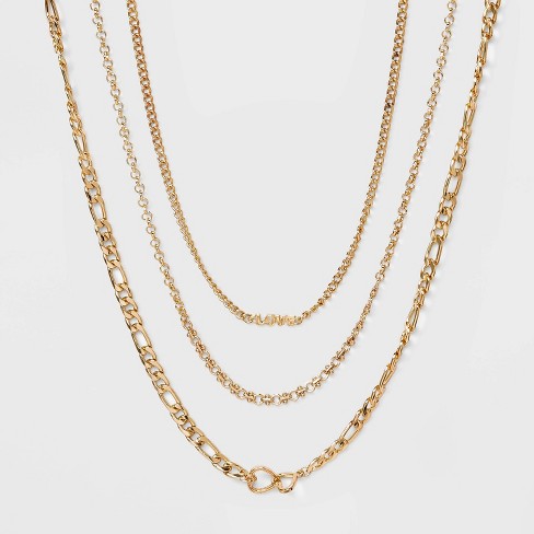 Woman Gold Plated Elizabeth Charm Necklace Triple Layer Rolo Link Chain. Triple Layer Chain Necklace.